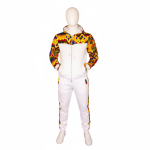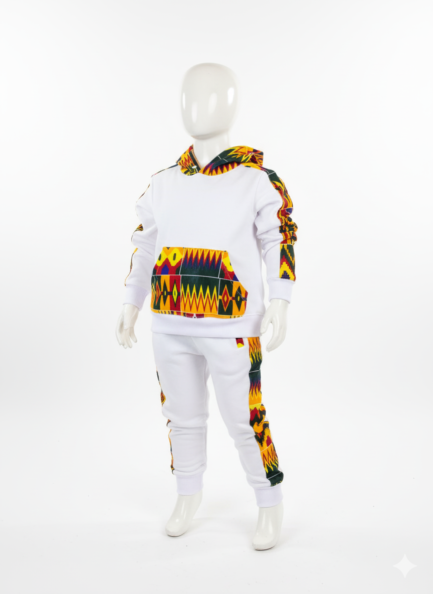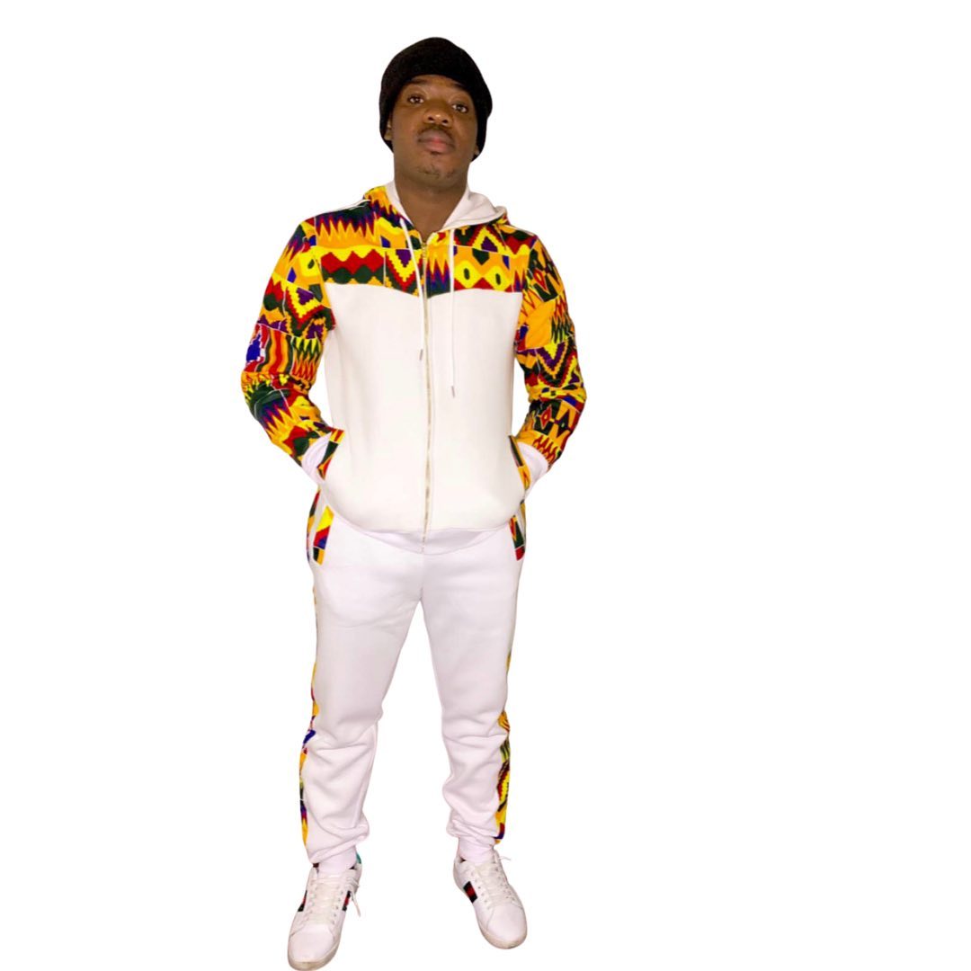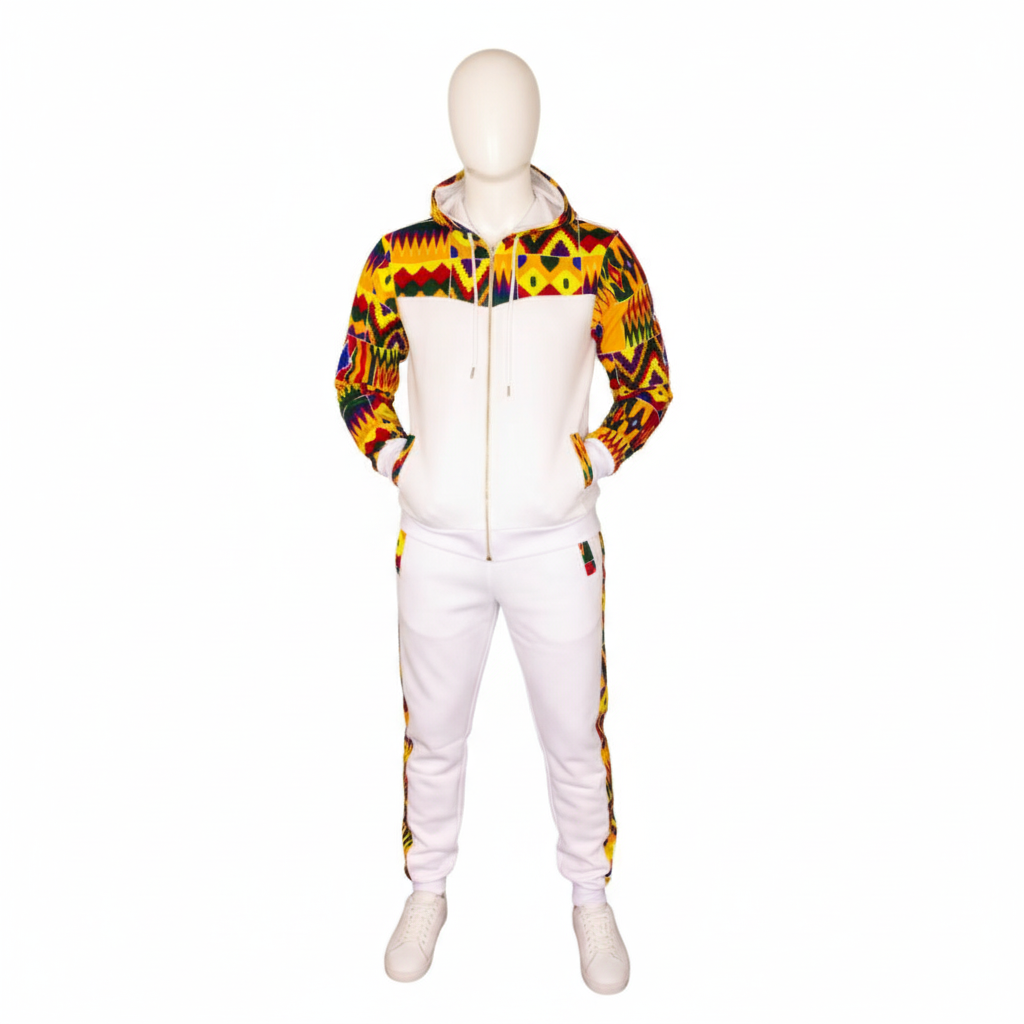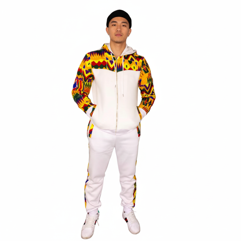 African Kente Print Tracksuit Set | White Hoodie & Joggers|Side Pocket