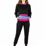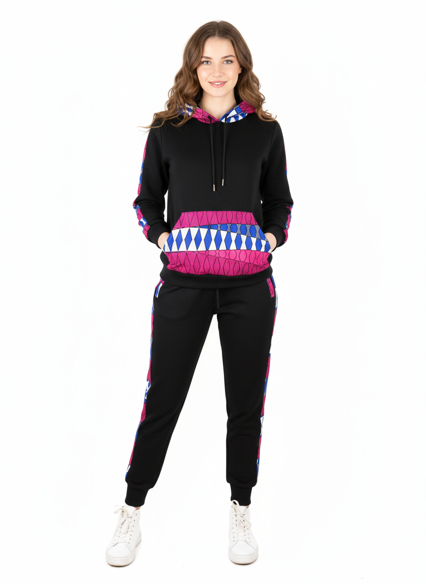 Step out in sophisticated style with The Majestic Pink/Blue Tracksuit. This striking two-piece set features a crisp white base fabric with a distinct pink and blue diamond/geometric pattern accenting the chest, hood, and sleeves, and running down the jogger seams. The full-zip hoodie and comfortable joggers are made from a soft, quality material, offering a perfect blend of cozy athletic wear and bold, colorful design. Ideal for making a statement while maintaining comfort.