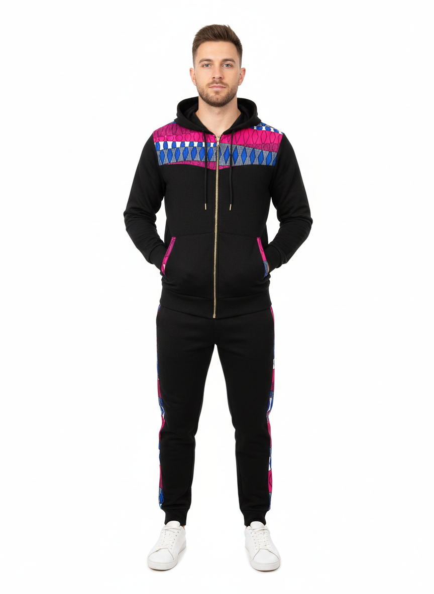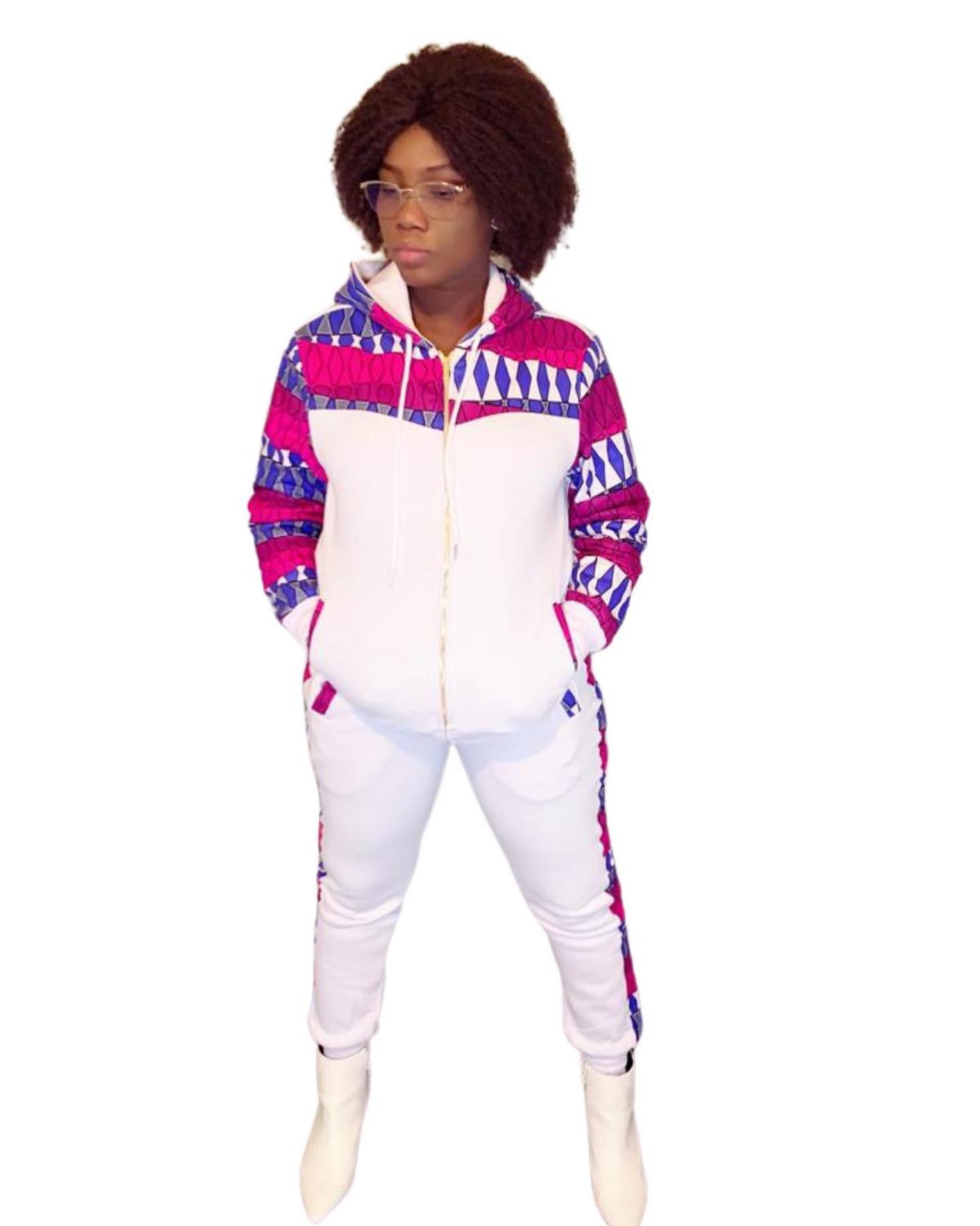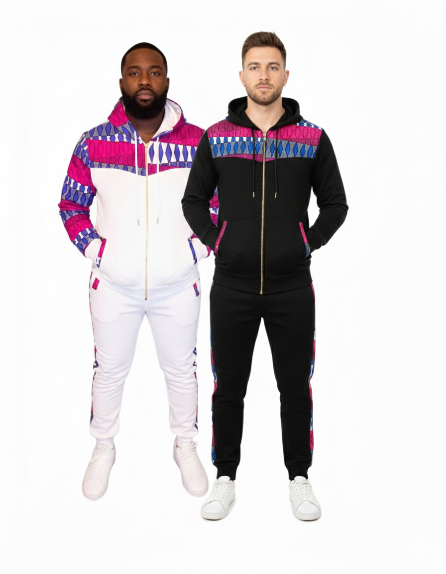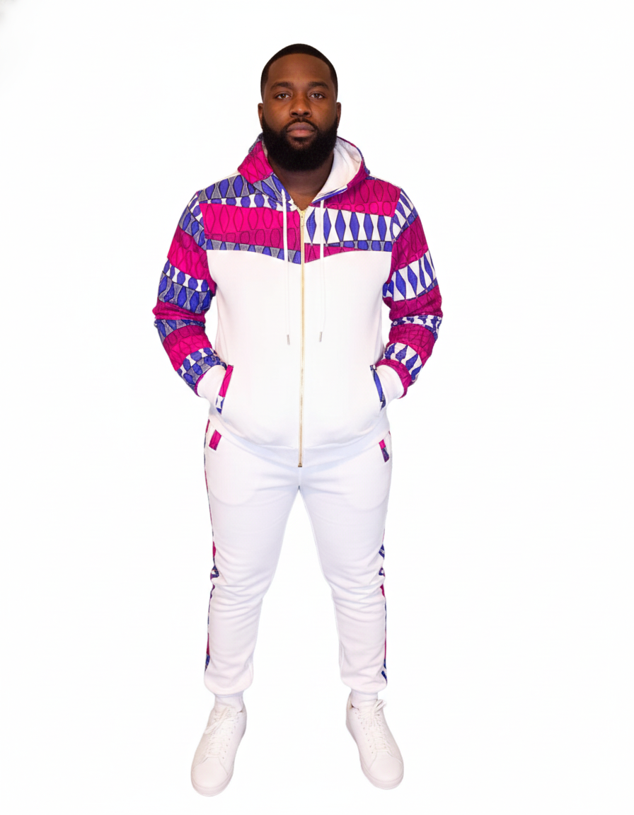 Step out in sophisticated style with The Majestic Pink/Blue Tracksuit. This striking two-piece set features a crisp white base fabric with a distinct pink and blue diamond/geometric pattern accenting the chest, hood, and sleeves, and running down the jogger seams. The full-zip hoodie and comfortable joggers are made from a soft, quality material, offering a perfect blend of cozy athletic wear and bold, colorful design. Ideal for making a statement while maintaining comfort.