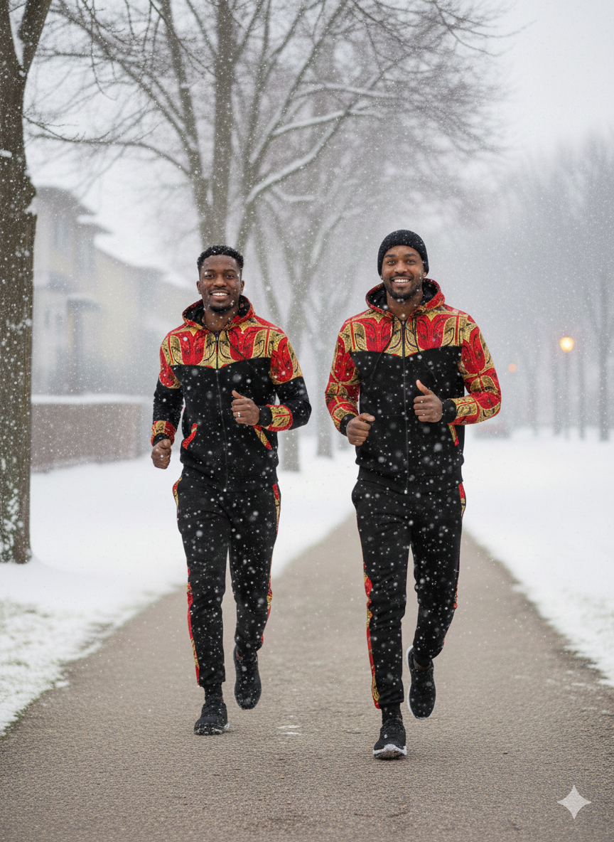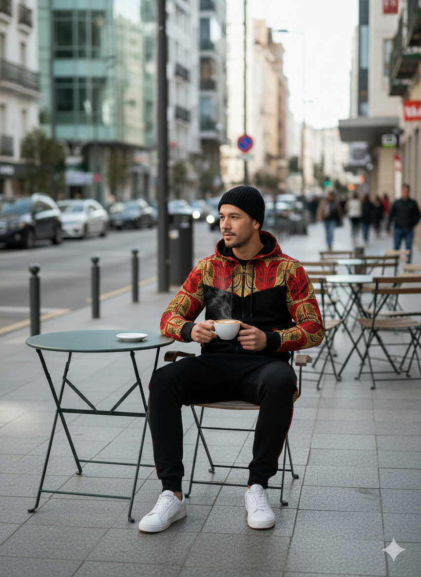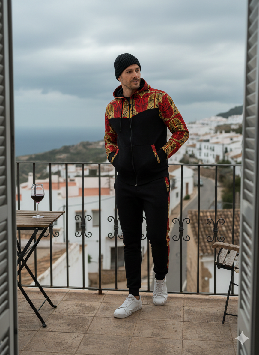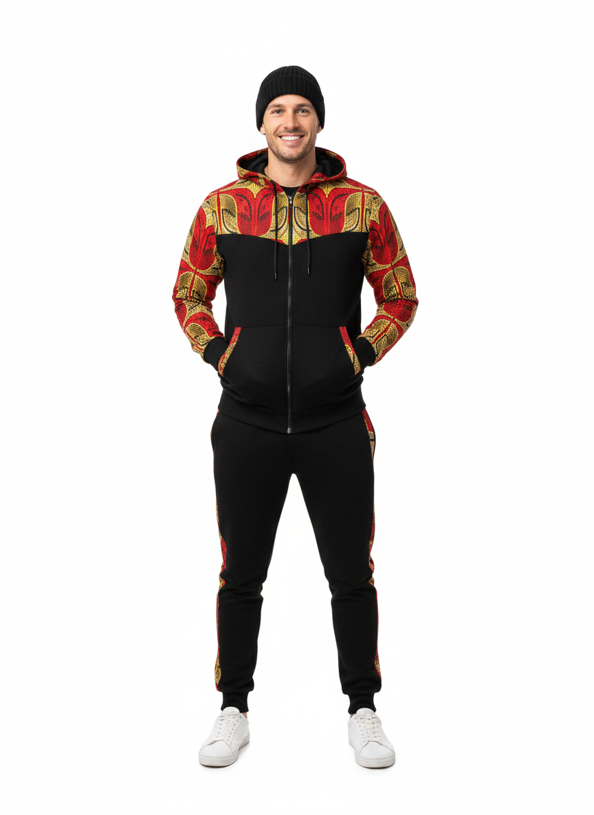 Blend heritage and contemporary streetwear with The Red African Print Tracksuit. This striking two-piece set features a comfortable grey heather base, perfectly accented by vibrant, high-contrast Red African Print panels on the shoulders, hood lining, and along the jogger seams. Crafted for comfort and designed to stand out, this unique ensemble combines soft, breathable material with a bold, eye-catching design, making it ideal for travel, casual outings, or elevated athletic wear.