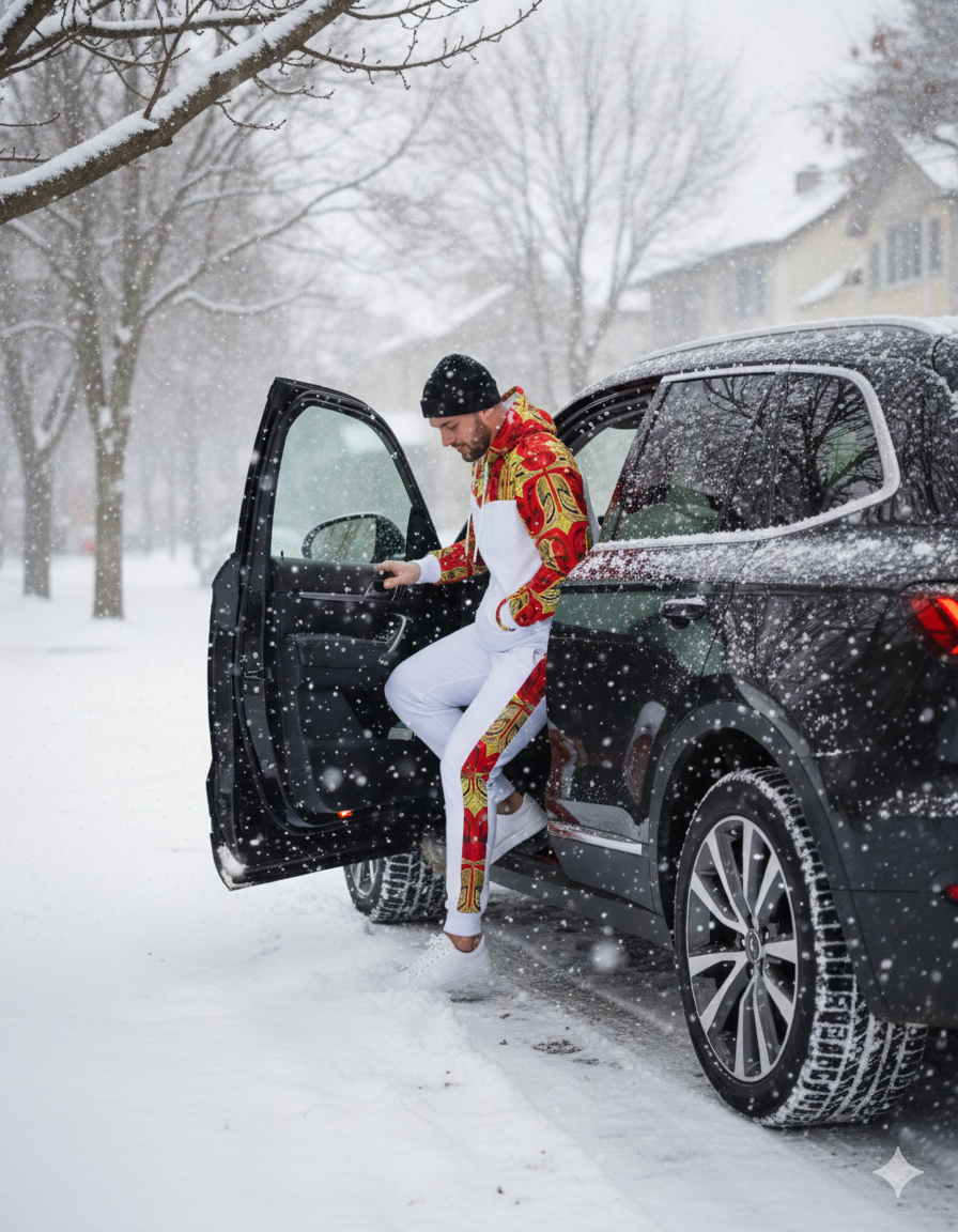 Blend heritage and contemporary streetwear with The Red African Print Tracksuit. This striking two-piece set features a comfortable grey heather base, perfectly accented by vibrant, high-contrast Red African Print panels on the shoulders, hood lining, and along the jogger seams. Crafted for comfort and designed to stand out, this unique ensemble combines soft, breathable material with a bold, eye-catching design, making it ideal for travel, casual outings, or elevated athletic wear.